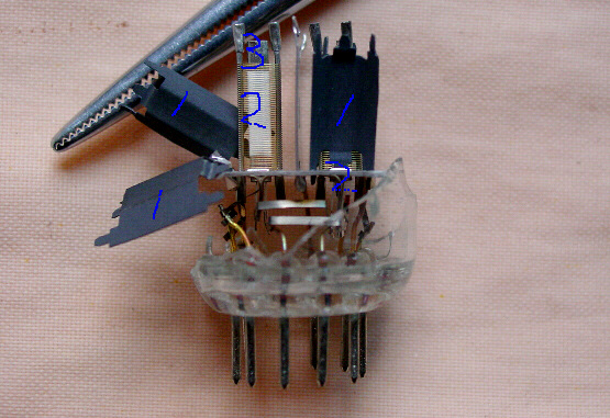 瞧清楚! 1:阳极;2:栅极,栅极里白色部分是栅极和阴极的绝缘层;3 就是阴极,这是个扁型金属管,灯丝就包在里面啦。